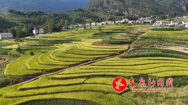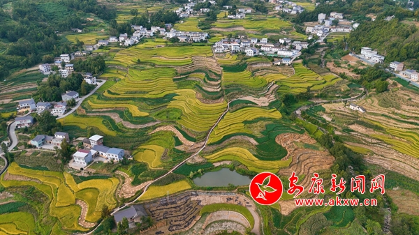 鳳堰梯田的1.2萬(wàn)畝連片水稻迎來(lái)了豐收季,蜿蜒盤(pán)旋的金黃色線(xiàn)條從山腳盤(pán)繞至山腰,層層疊疊的稻田與整潔的村莊、蜿蜒的道路、遠(yuǎn)方的青山相映成趣,美不勝收。農(nóng)戶(hù)們也搶抓晴好天氣,確保顆粒歸倉(cāng),勤勞的鄉(xiāng)親們穿梭在稻田中,構(gòu)成了一幅祥和而廣闊的秦巴山區(qū)農(nóng)耕文明美麗畫(huà)卷。