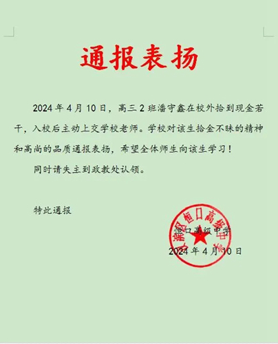 2024年4月10日早晨,高三2班潘守鑫同學(xué)在校門口拾到人民幣若干,在原地等了一會(huì)沒有失主來(lái)找,他毫不猶豫地走進(jìn)校園把錢交給政教處劉顯平老師。潘守鑫同學(xué)的行為展現(xiàn)了恒中學(xué)子良好的社會(huì)公德和個(gè)人素養(yǎng),為同學(xué)們樹立了一個(gè)好榜樣!