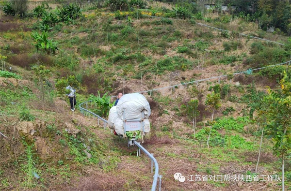 2022年,常州市新北區(qū)對口幫扶嵐皋縣聯(lián)絡(luò)組專門撥付蘇陜協(xié)作資金350萬元,為當?shù)匕l(fā)展獼猴桃、碧根果等產(chǎn)業(yè)的村子安裝山地軌道運輸車20公里,直接讓3500畝土地的種植戶受益。軌道運輸車的安裝,讓當?shù)厝罕姀拇烁鎰e了依靠人力肩挑背扛的歷史。包括獼猴桃、黃豆、紅薯等在內(nèi)的所有莊稼,從此在地里收獲后,只需要主人裝入軌道運輸車,就可以直接送到農(nóng)用車上,然后拉回家。