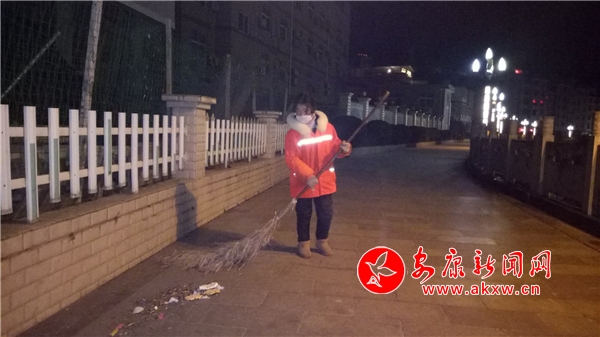 圖為環(huán)衛(wèi)工人吳志美大年初一、初五凌晨街上空無一人的時(shí)候,她默默的在清掃大街小巷(筆者晨練偶遇隨拍), 他用一身寒霜溫暖縣城清晨!