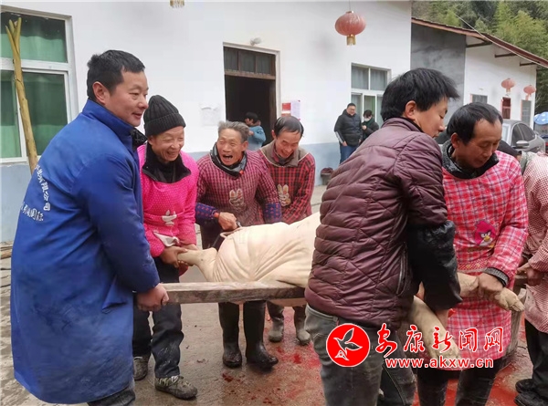 五組村民余美軒當(dāng)天要宰殺6頭年豬,除了留1頭自己食用外,其余5頭早就被人預(yù)定,客戶一早就來到他家等候。余美軒家有4口人,屬一般脫貧戶,兒子有時(shí)在外打零工,生豬主要用自己種植的玉米、紅薯、洋芋,加上紅薯藤和一些青草菜葉喂養(yǎng),平時(shí)只需要購買了少量飼料。通過一年辛勤喂養(yǎng),每頭豬大約有200斤肉,售價(jià)4000余元,靠養(yǎng)豬他們今年就有2萬余元的收入。