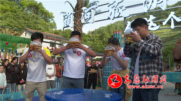 距離鄉(xiāng)愁館不遠(yuǎn)的摔碗酒比賽現(xiàn)場熱鬧非凡,一位身著地方特色服飾的村民與游客劃拳定輸贏,游客贏了便能免費(fèi)得到一壇嵐皋陳釀,游客輸了便要喝摔碗酒一碗,不管輸贏與否,都能引起在場群眾的陣陣歡笑。