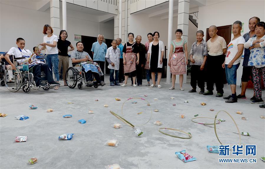 寧陜縣中心敬老院五保失能托養(yǎng)中心內(nèi),托養(yǎng)人員在一起進行套圈游戲(8月20日)。 自2016年9月起,陜西寧陜縣開始實行貧困失能、半失能人員集中供養(yǎng),為其提供干凈舒適的住所、24小時全面護理,不僅讓貧困失能、半失能人員得到良好照料,也徹底將失能家庭解放出來,全身心脫貧致富奔小康。目前,寧陜登記在冊貧困失能、半失能人員共有467人,其中320人已分別在全縣4個敬老院的五保失能托養(yǎng)中心內(nèi)進行集中供養(yǎng),剩余人員將于托養(yǎng)中心床位逐步完善后全部入住。 新華社記者 劉瀟 攝yCp安康新聞網(wǎng)