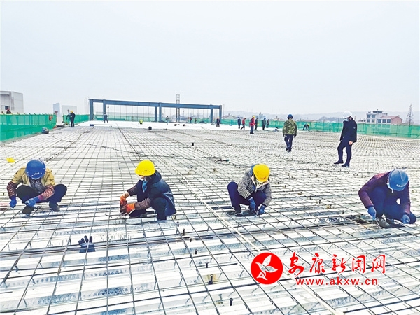 在寧陜縣飛地園區(qū)標準化廠房二期第3批次項目建設工地,工人在進行第三層封頂。