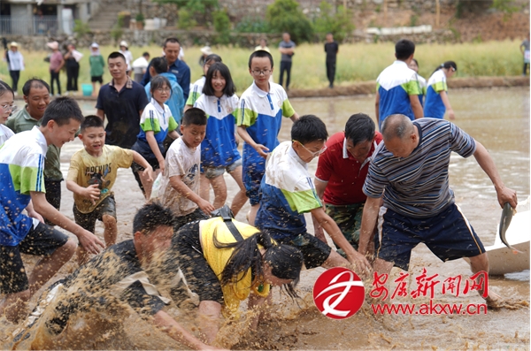 插秧比賽后緊接著開(kāi)展了拔河比賽,參賽者們光著腳在泥濘的田里奮力拉扯,你來(lái)我往,互不相讓,田邊的觀眾則奮力地為自己支持的隊(duì)伍加油鼓勁。稻田抓鴨捕魚(yú)活動(dòng)讓現(xiàn)場(chǎng)氣氛更加熱烈,觀眾紛紛脫下鞋襪,卷起褲腿,在稻田中追逐游魚(yú)和鴨子,歡快的笑聲此起彼伏。