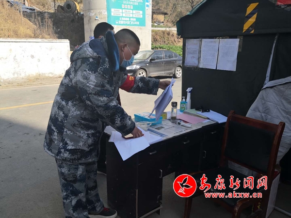 西壩村現(xiàn)役軍人陳玉沈在大疫面前,立書請戰(zhàn),成為了一名疫情防控志愿者,被分派到平利西河鎮(zhèn)段家河監(jiān)測勸返點,負(fù)責(zé)值班值守,監(jiān)測勸返。