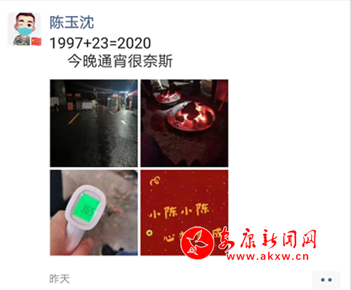 陳玉沈被分派防疫一線后,村上干部一直都在關(guān)注他的工作狀況,傍晚的時候村支部書記發(fā)現(xiàn)他在朋友圈發(fā)了一句“1997+23=2020,今晚通宵很奈斯”的話后,大家才推斷出,今天是陳玉沈23歲生日,他還在堅守崗位,通宵值守。