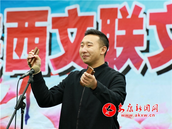 下午2點,社區(qū)文化廣場鑼鼓喧天,平利縣老縣鎮(zhèn)新時代農(nóng)民文化宣傳隊以《戰(zhàn)鼓齊奏新時代》開場鑼鼓拉開慰問演出的帷幕,在陜西廣播電視臺節(jié)目主持人郝寧、李菲的報幕聲中,男聲獨唱《我愛你中國》、相聲《歡歌笑語》、戲曲選段《繡紅旗》、雜技《頂缸》、女聲獨唱《帕米爾,我的家鄉(xiāng)多么美》、陜西快書《老侯赴宴》、女聲獨唱《請到茶鄉(xiāng)來》、魔術(shù)脫口秀《歐買嘎》、男聲獨唱《把一切獻(xiàn)給黨》、小品《采訪的故事》、四重唱《幸福的誓言》等內(nèi)容豐富、形式多樣的精彩節(jié)目接連登場,輪番表演,異彩紛呈的節(jié)目博得現(xiàn)場觀眾掌聲陣陣,喝彩之聲不絕于耳。演出期間,慰問小分隊的書畫藝術(shù)家向平利縣模范人物贈送了書畫作品。
