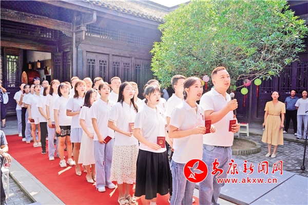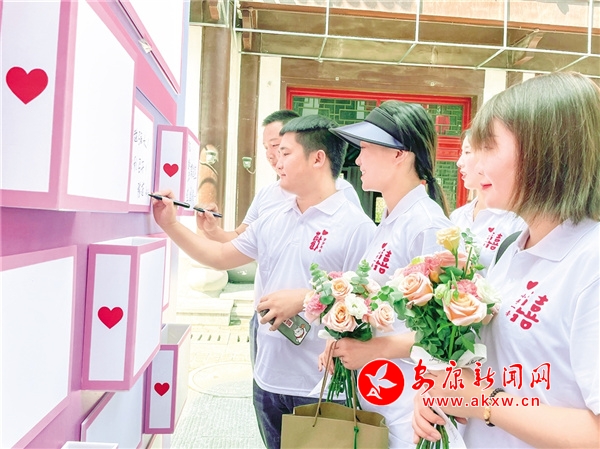 “和氣致祥”“真愛長春”“和鳴盛世”等書法作品為新人送上美好祝愿,以此倡導文明、健康、理性的婚戀觀和家庭觀,引導新人們感悟銘記婚姻締結之神圣、婚姻家庭之責任、婚姻和諧之美好,樹立社會新風尚。“穿針乞巧”“曬書曬才”“編中國結”……一對對新人積極踴躍、各顯神通。手執(zhí)五色絲線,同時連續(xù)穿過五孔針,比一比誰能最先將線快速全部穿過針孔,期待“得巧”;巧手編織中國結,傳承紅色中國情,七夕飛花與詩,情意綿綿,深遠悠長。