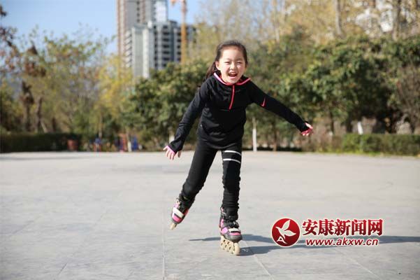 小姑娘玩輪滑時(shí)露出天真的笑容