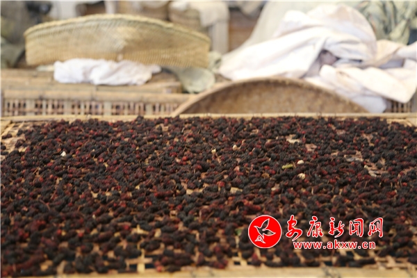 桑葚鮮果保鮮時間短,采摘后不及時銷售便會造成損失。明星村大陽蠶桑支部通過和石泉縣錦絲盛農(nóng)業(yè)科技有限公司合作,采取“支部+合作社+公司+農(nóng)戶”的發(fā)展模式,將一部分鮮果通過工廠加工,將銷售價格為5元每斤的新鮮桑葚精選制成桑葚干,桑葚干售價60元每斤;另一部分桑葚釀造成桑葚果酒,還有一部分桑葚可以通過蒸餾古法烤酒的方式制成白酒。以此增加桑葚的附加值,通過提升桑葚的附加值,增加農(nóng)民的收入。