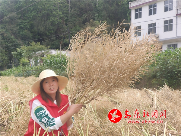 在油菜地里,朱貴武手持鐮刀,向參加勞動(dòng)的同志講解,“握刀柄的力度要恰當(dāng),松了刀會(huì)脫手,緊了可能把自己給傷了,同時(shí)要注意腳底下的茬子,不要摔倒了,干農(nóng)戶沒多大的技巧,要自己去熟悉掌握,要多看下種地老前輩是怎么做的”。