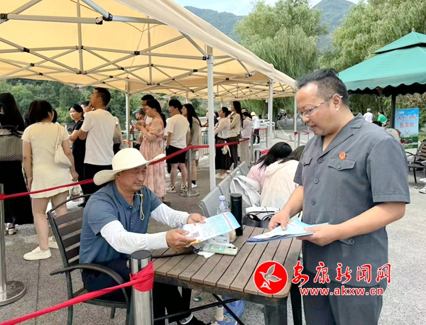 在各大景區(qū),法官干警給旅游景區(qū)的工作人員講解相關(guān)法律知識(shí)、教他們?nèi)绾我婪皶r(shí)處理與游客之間的矛盾糾紛,確保一旦發(fā)生旅游糾紛,第一時(shí)間有人報(bào)告、第一時(shí)間有人接待、第一時(shí)間有人解決。向來(lái)往游客和景區(qū)工作人員發(fā)放旅游法宣傳手冊(cè),對(duì)游客較為關(guān)注的“旅游者的權(quán)利、旅行社的義務(wù)、旅游安全如何保障、旅游糾紛如何解決”等進(jìn)行詳細(xì)解答,并向游客積極熱情解答各類法律咨詢。