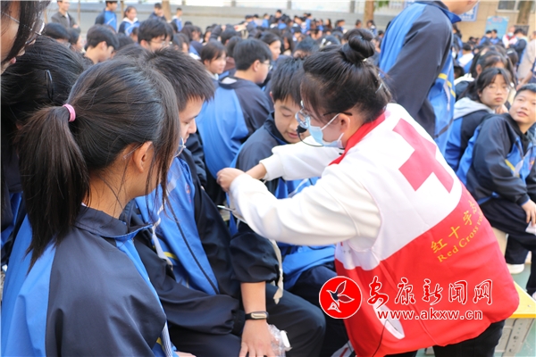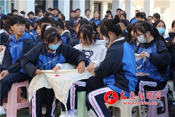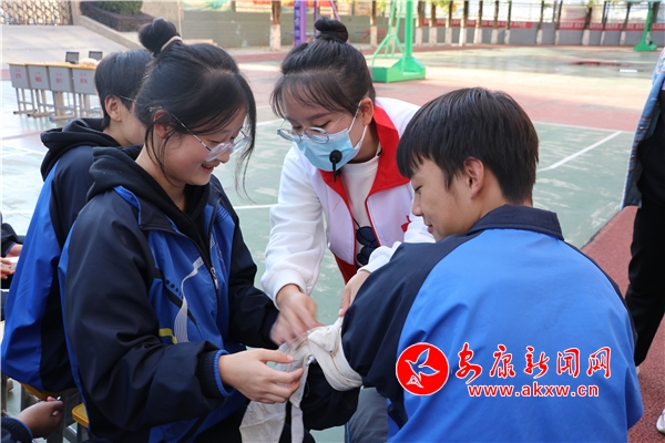 活動中,縣紅十字會工作人員向?qū)W生發(fā)放了三角巾,現(xiàn)場向?qū)W生講解了三角巾的結(jié)構(gòu)和各部分的功能,并以手臂、肩部和胸部三個部位受傷為例做了操作示范,手把手地指導(dǎo)學(xué)生如何包扎、如何敷料、如何固定、如何打結(jié)。同學(xué)們邊觀察邊實(shí)操,不時和工作人員進(jìn)行互動,尋求專業(yè)指導(dǎo),親手體驗(yàn)三角巾包扎的操作流程,在鍛煉動手實(shí)踐能力的同時,掌握身體受傷的應(yīng)急處理技能,增強(qiáng)應(yīng)對突發(fā)事件的自護(hù)自救和科學(xué)救護(hù)能力。