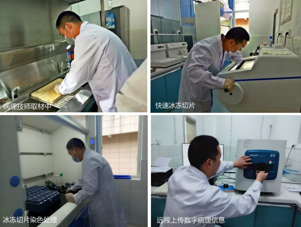 病理科工作人員快速接收標(biāo)本、取材、冰凍制片、標(biāo)本染色、將標(biāo)本切片插入遠(yuǎn)程醫(yī)療數(shù)字病理掃描系統(tǒng)進(jìn)行掃描讀片,掃描系統(tǒng)實時將切片信息同步傳輸至安康市中醫(yī)醫(yī)院病理遠(yuǎn)程診斷中心。