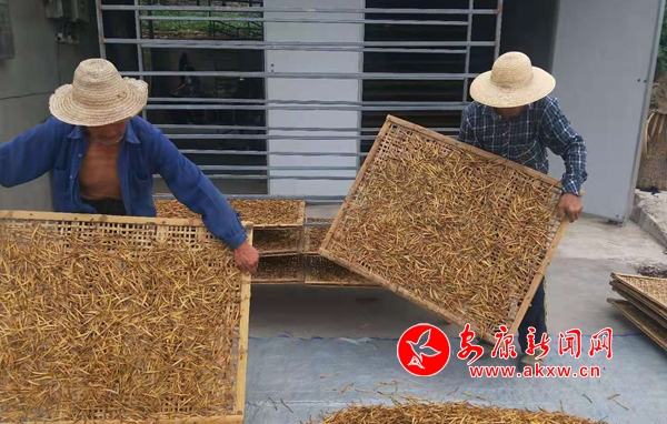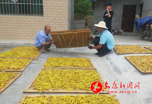 當(dāng)然,要把黃花菜制成成品不單單是采摘回收那么簡(jiǎn)單,還需要經(jīng)過(guò)殺青、晾曬、烘烤、挑選等多道程序。“現(xiàn)在我們平均每天可以回收新鮮黃花菜四五百斤,制成干黃花后,市場(chǎng)價(jià)每斤可以賣(mài)到30元左右。”金竹村支部書(shū)記、天門(mén)山農(nóng)業(yè)專業(yè)合作社理事長(zhǎng)詹先斌邊忙碌邊向我們介紹道。三年來(lái),在他和鄉(xiāng)親們的共同努力下,“金竹黃花”在當(dāng)?shù)氐拿麣庠絹?lái)越響,金竹村天門(mén)山農(nóng)業(yè)專業(yè)合作社也一步步發(fā)展壯大,成長(zhǎng)為一家集種植、生產(chǎn)、加工、銷(xiāo)售黃花菜為一體的綜合性農(nóng)業(yè)專業(yè)合作社,詹先斌成為了村里名副其實(shí)的致富“領(lǐng)頭人”。