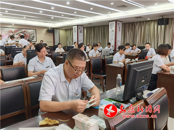 據(jù)了解,此次比賽設(shè)置了翻打百?gòu)垈髌、字符錄入和手工點(diǎn)鈔、業(yè)務(wù)知識(shí)競(jìng)賽四個(gè)項(xiàng)目。在翻打百?gòu)垈髌焙蜐h字錄入環(huán)節(jié),選手們靈巧的雙手在計(jì)算器和鍵盤上游走,伴隨著“噼里啪啦”敲擊聲,只見(jiàn)一個(gè)個(gè)數(shù)字答案輸入考試系統(tǒng),一行行字符在電腦屏幕上快速跳動(dòng)。在點(diǎn)鈔比賽中,選手們單指單張、多指多張等多種點(diǎn)鈔手法各顯風(fēng)采,清點(diǎn)、墩齊、扎把、蓋章,每個(gè)步驟都環(huán)環(huán)相扣,一絲不茍,嫻熟的手法讓人目不暇接,印象深刻。