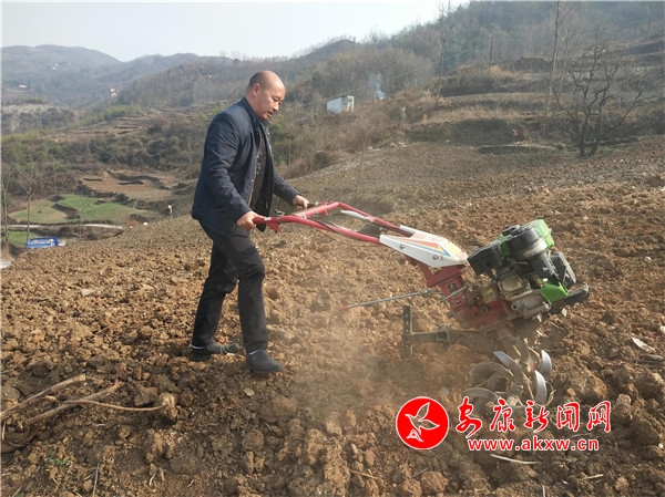 在金寨鎮(zhèn)譚家院社區(qū)六組,45歲的煙農(nóng)朱章斌正在煙田熟練操縱著旋耕機(jī),他趁著最近晴好天氣,啟動(dòng)春耕整地工作。