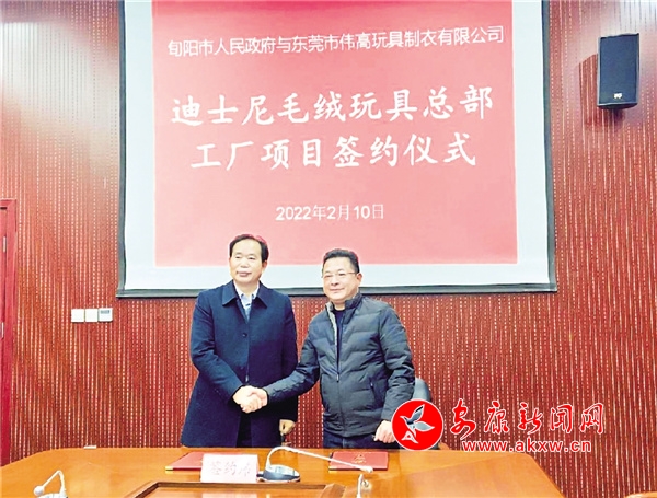 旬陽(yáng)市委副書(shū)記、代市長(zhǎng)羅本軍(左一)出席迪士尼毛絨玩具總部工廠項(xiàng)目簽約儀式