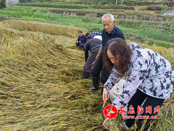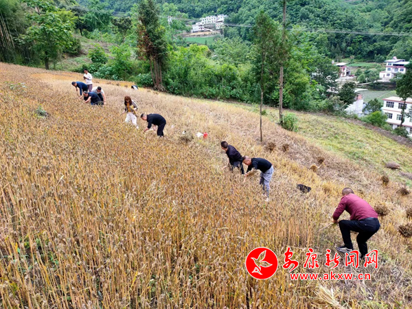 “大家再加把勁兒,這一塊馬上要收割完了,完了我們轉(zhuǎn)戰(zhàn)老李家。”在黑溝村二組石槽溝梁利鵬的麥田里,鎮(zhèn)村黨員干部、左鄰右舍與“時(shí)間”賽跑,割麥、捆扎、搬運(yùn)……大家分工協(xié)作,動(dòng)作嫻熟利索、揮汗如雨,不一會(huì)兒,五畝小麥全部收割完成。