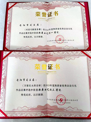 本網(wǎng)訊(通訊員 黃倩) 近日,陜西省委普法辦通報(bào)了2023年度全省優(yōu)秀法治文化作品獲獎(jiǎng)名單,共評(píng)出5類132件獲獎(jiǎng)作品,其中由旬陽市司法局選送的原創(chuàng)普法民歌劇《村官巧斷家務(wù)事》和漢調(diào)二黃歌舞《萬家燈火傳吉祥》分別榮獲歌舞曲藝類一等獎(jiǎng)、三等獎(jiǎng)。