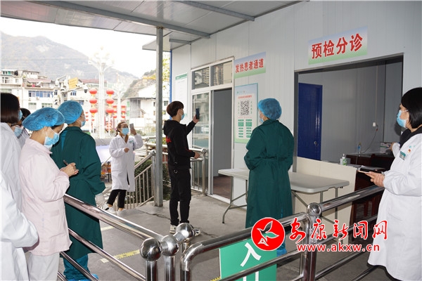 應急演練設置來自高風險區(qū)返回患者、伴發(fā)熱人員接觸史的發(fā)熱患者的就診及處置流程。一名成年女性于10月25日自國內(nèi)中風險地區(qū)(新疆喀什疏附縣)返回鎮(zhèn)坪,10月28日出現(xiàn)發(fā)熱、咳嗽、乏力等不適癥狀,10月29日06:30到該院就診,體溫38.3。演練主要涉及預檢分診、發(fā)熱門診,演練按照預先制定的演練方案進行,包括引導就診,消毒處理、個人防護、轉(zhuǎn)運路線、人員交接、疫情報告、醫(yī)療廢物處置等相關(guān)內(nèi)容。從演練過程來看,各環(huán)節(jié)銜接到位,程序流暢,配合默契,參與人員都能認真觀摩學習。