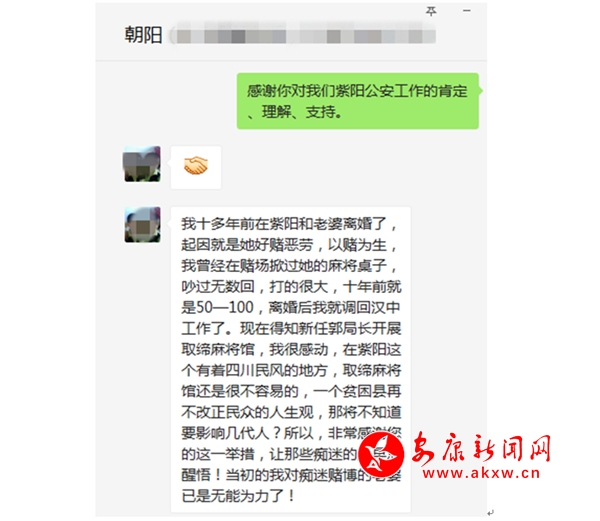 前幾日,幾位廣東打工的紫陽村民聯(lián)名向局領(lǐng)導(dǎo)發(fā)來微信:“尊敬的局領(lǐng)導(dǎo):我們是貧困村的村民,為了擺脫貧困,不得已遠(yuǎn)離家鄉(xiāng),告別親人,背井離鄉(xiāng),來廣東打工,可村里到處都是麻將館、棋牌室,男人在外辛苦打工,把血汗錢寄回家,女人卻在村里的麻將館打麻將,一打就是一整天,孩子和老人的飲食無人照料。家里土地大片荒蕪,坐在麻將桌上為幾元錢的賭資爭的臉紅脖子粗,甚至大打出手。長此以來,造成家庭不和睦,鄰里不和諧,社會不穩(wěn)定。十分感謝縣公安局這次貧困村禁賭,使我們外出打工的人看到了脫貧的希望。”