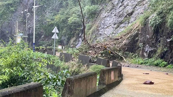 洄堰路200米處(交警中隊附近)山體垮塌,大量樹木傾倒到路面,造成交通中斷。