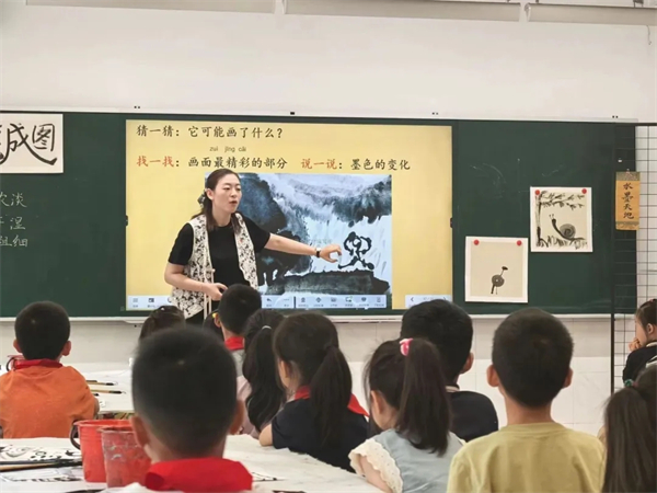 活動(dòng)中,鐘樓第二實(shí)驗(yàn)小學(xué)副校長方文婷和常州經(jīng)開區(qū)教學(xué)部主任楊婷老師分別呈現(xiàn)了一年級美術(shù)課程《葉子片片》和《練筆成圖》。兩位老師的課程內(nèi)容充滿創(chuàng)新與深度。授課內(nèi)容從印刷術(shù)與拓染法相結(jié)合,引導(dǎo)學(xué)生們探索美術(shù)與生活的緊密聯(lián)系,到通過手指操的引導(dǎo),幫助孩子們在逐漸掌握水墨畫的基本坐姿和執(zhí)筆方法中感受傳統(tǒng)文化魅力。