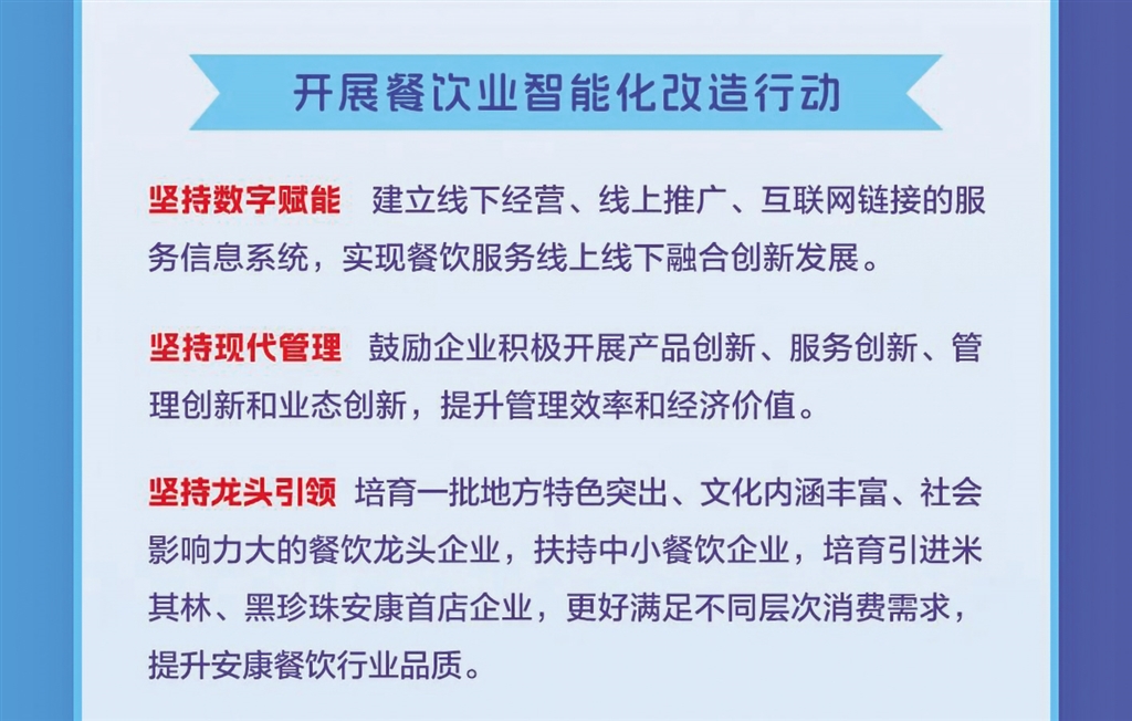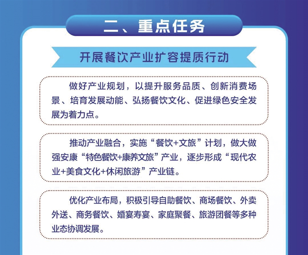 日前,安康市商務(wù)局等11部門(mén)聯(lián)合發(fā)布《關(guān)于進(jìn)一步推進(jìn)全市餐飲業(yè)高質(zhì)量發(fā)展的實(shí)施意見(jiàn)》,本期帶您一圖讀懂其重點(diǎn)任務(wù)。QNg安康新聞網(wǎng)