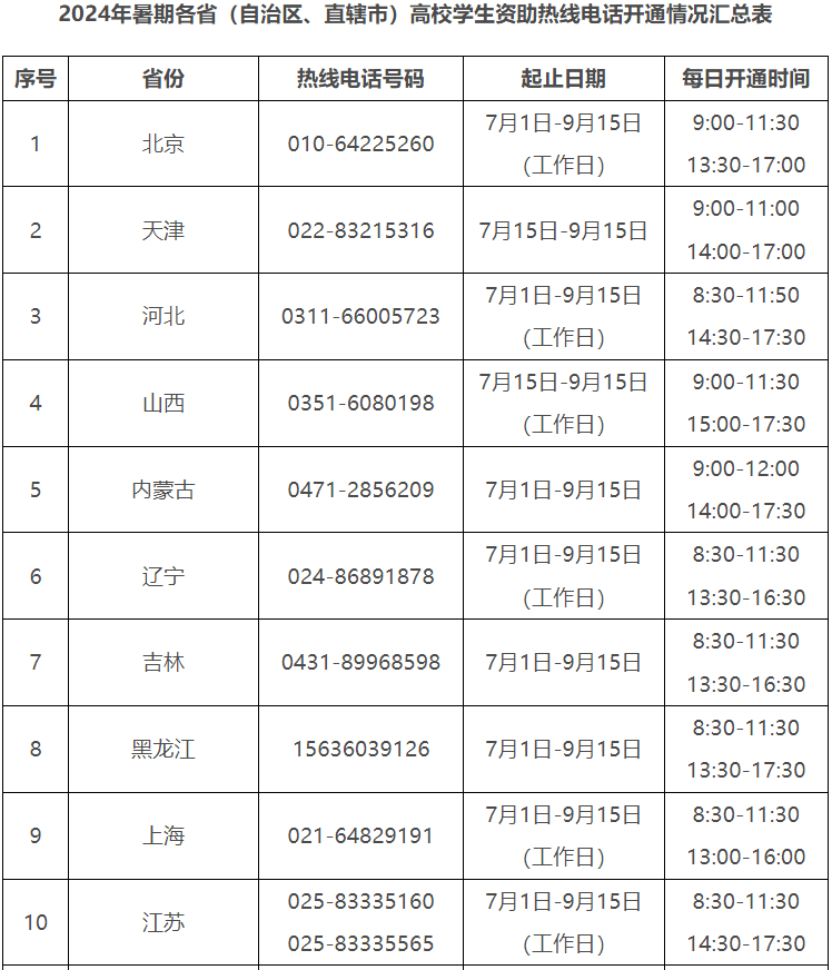今年暑期,教育部將繼續(xù)開(kāi)通高校學(xué)生資助熱線(xiàn)電話(huà),號(hào)碼為010—66097980、010—66096590,受理時(shí)間為7月1日—9月15日,每天8:00—20:00,為大學(xué)新生特別是家庭經(jīng)濟(jì)困難的大學(xué)新生提供資助政策咨詢(xún)與幫助。