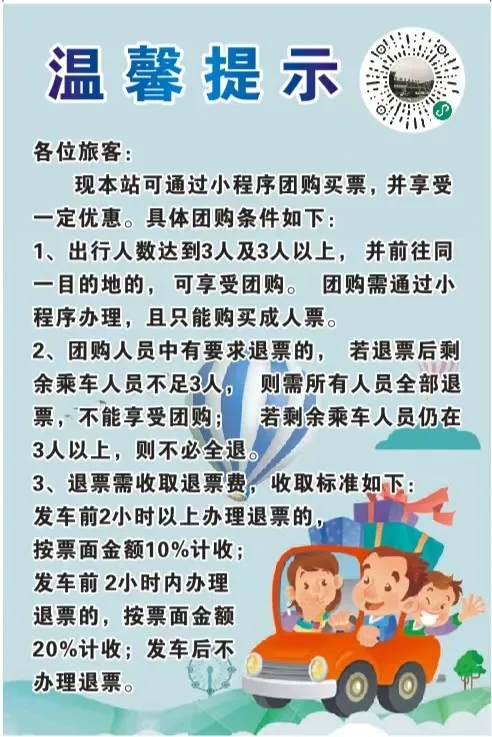 新增團(tuán)購小程序,目前開啟安康——紫陽團(tuán)購票,紫陽全程68公里,途經(jīng)包茂高速,運行大約1小時。票價最低20元起,三人可成團(tuán),購票更優(yōu)惠!下方圖片內(nèi)二維碼可快速購買。
