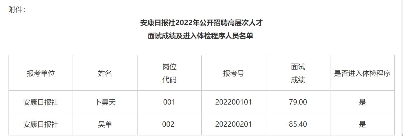 根據(jù)《安康日?qǐng)?bào)社2022年公開招聘高層次人才公告》規(guī)定,現(xiàn)將安康日?qǐng)?bào)社2022年公開招聘高層次人才面試成績(jī)及進(jìn)入體檢程序人員名單(見附件)、體檢有關(guān)事項(xiàng),公告如下: