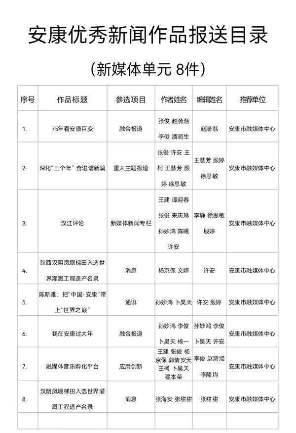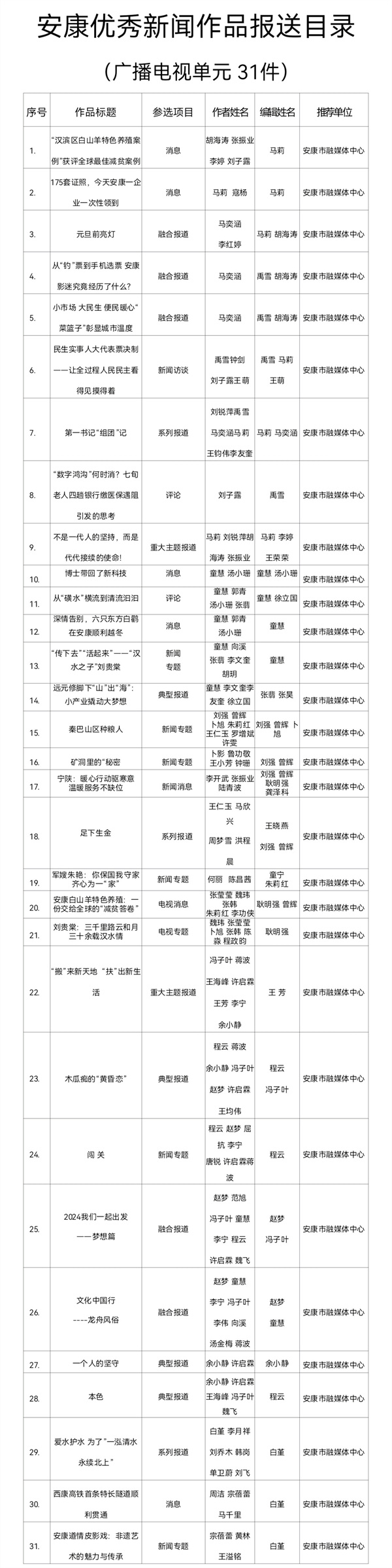 根據(jù)《關于開展2024年度安康優(yōu)秀新聞作品、安康市優(yōu)秀新聞工作者推選工作的通知》(安記協(xié)〔2025〕04號)文件要求,經(jīng)推薦、領導審核,安康市融媒體中心推薦參評2024年度安康優(yōu)秀新聞作品97件(報紙單元58件,廣播電視單元31件,新媒體單元8件),F(xiàn)將報送作品目錄(詳見附件)予以公示。