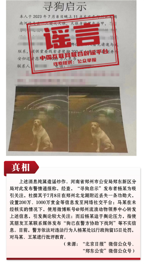謠言9:鄭州有人懸賞1000萬(wàn)尋找丟失愛(ài)犬?