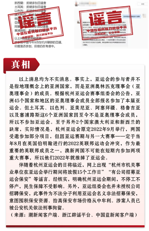 謠言6:八個(gè)國(guó)家宣布不參加杭州亞運(yùn)會(huì)?杭州因舉行亞運(yùn)會(huì)將于9月10日至25日放假?