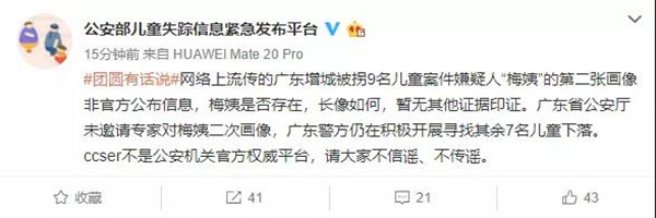 網(wǎng)絡(luò)上流傳的廣東增城被拐9名兒童案件嫌疑人“梅姨”的第二張畫像非官方公布信息,梅姨是否存在,長像如何,暫無其他證據(jù)印證。廣東省公安廳未邀請專家對梅姨二次畫像,廣東警方仍在積極開展尋找其余7名兒童下落。ccser不是公安機(jī)關(guān)官方權(quán)威平臺,請大家不信謠、不傳謠。