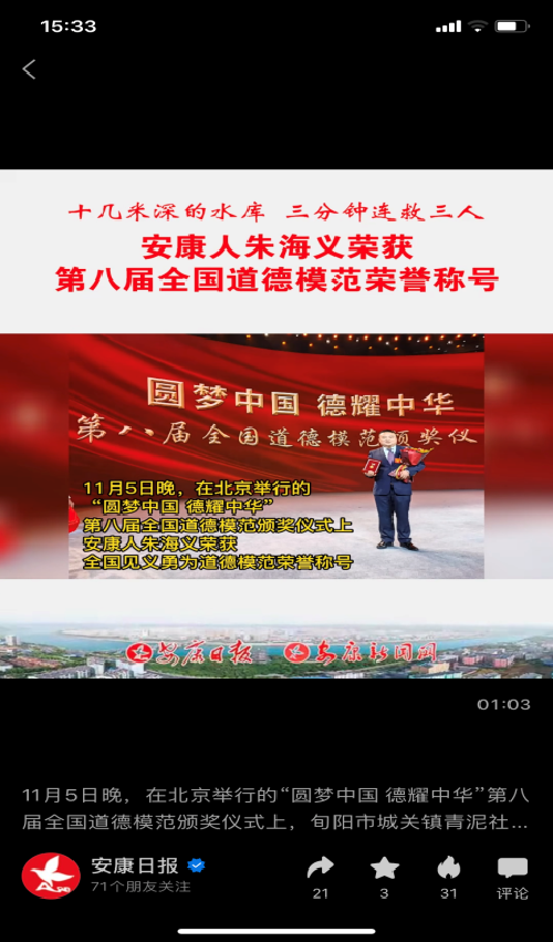 安康日?qǐng)?bào)微信視頻號(hào)發(fā)布“第八屆全國(guó)道德模范朱海義”
