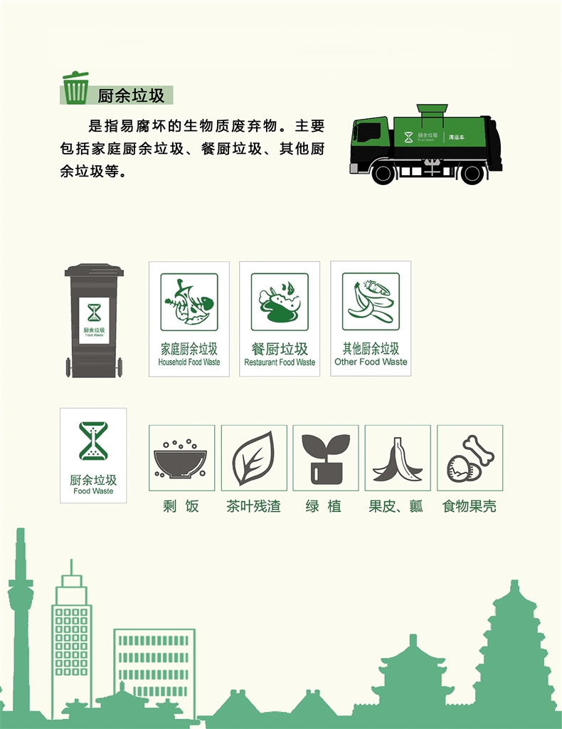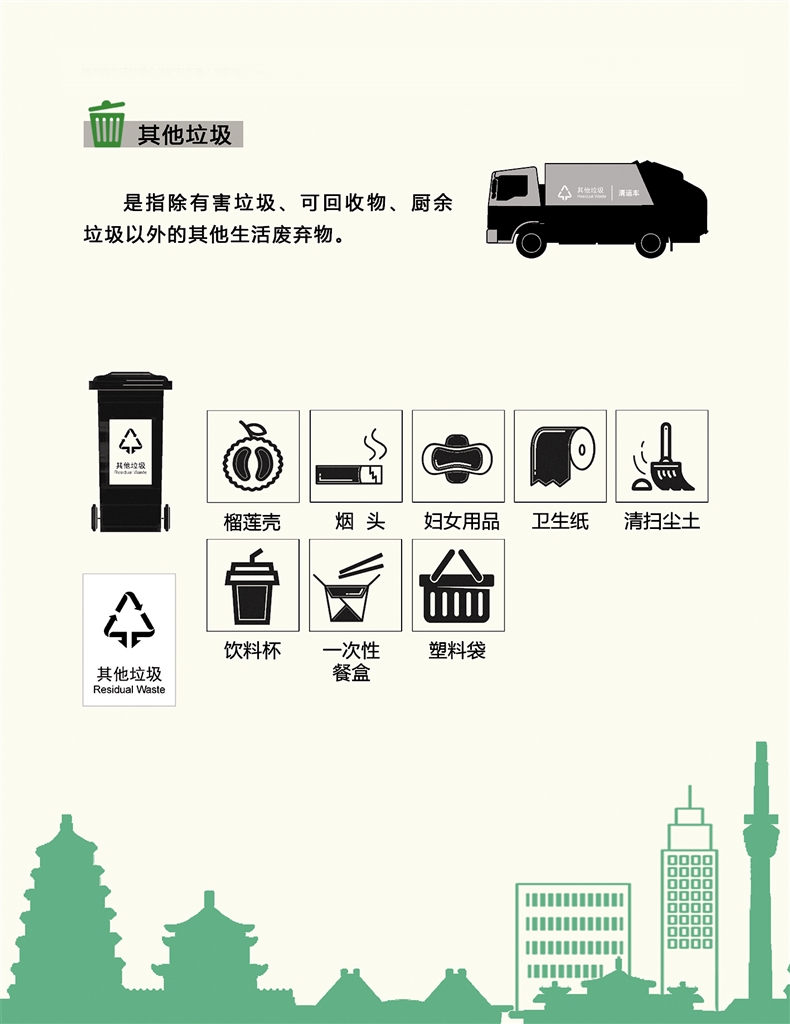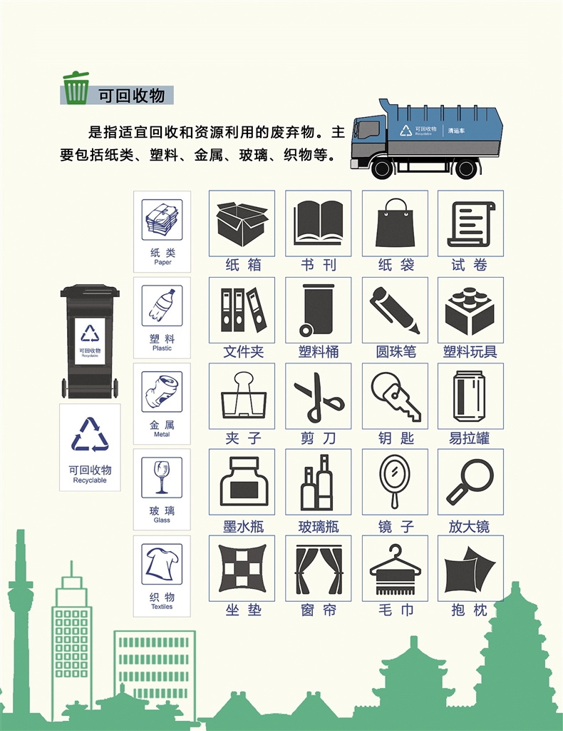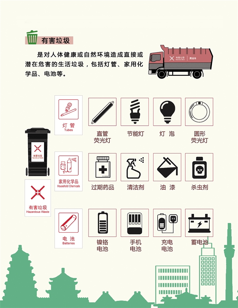 垃圾可以分為可回收垃圾、廚余垃圾、有害垃圾和其他垃圾四類。可回收垃圾主要包括廢紙、塑料、玻璃、金屬和布料五大類;廚余垃圾包括剩菜剩飯、骨頭、菜根菜葉、果皮等食品類廢物;有害垃圾包括廢電池、廢日光燈管、廢水銀溫度計、過期藥品等,這些垃圾需要特殊安全處理;其他垃圾包括除上述幾類垃圾之外的磚瓦陶瓷、渣土、衛(wèi)生間廢紙、紙巾等難以回收的廢棄物,采取衛(wèi)生填埋可有效減少對地下水、地表水、土壤及空氣的污染。