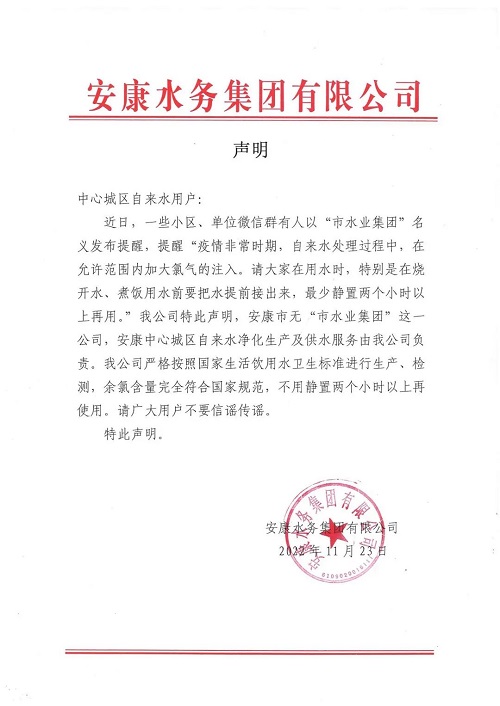 近日,一些小區(qū)、單位微信群有人以“市水業(yè)集團”名義發(fā)布提醒,提醒“疫情非常時期,自來水處理過程中,在允許范圍內加大氯氣的注入。請大家在用水時,特別是在燒開水、煮飯用水前要把水提前接出來,最少靜置兩個小時以上再用。”我公司特此聲明,安康市無“市水業(yè)集團”這一公司,安康中心城區(qū)自來水凈化生產及供水服務由我公司負責。我公司嚴格按照國家生活飲用水衛(wèi)生標準進行生產、檢測,余氯含量完全符合國家規(guī)范,不用靜置兩個小時以上再使用。請廣大用戶不要信謠傳謠。