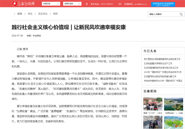 安康新聞網(wǎng)大力宣傳和踐行社會主義核心價值觀,大力宣傳中國夢,全媒體開設(shè)“社會主義核心價值觀”“新時代 新經(jīng)典”“我們的中國夢 文化進(jìn)萬家”等專欄,刊出《黨員干部要帶頭踐行核心價值觀》《讓新民風(fēng)吹遍幸福安康》《漢濱區(qū)市場監(jiān)管局:用心培育“文明花”》等一批重點稿件,正黨風(fēng)、淳民風(fēng)、興家風(fēng)、樹新風(fēng),宣傳人民群眾為實現(xiàn)中國夢而奮勇拼搏的事跡,讓社會主義核心價值觀深入人心。