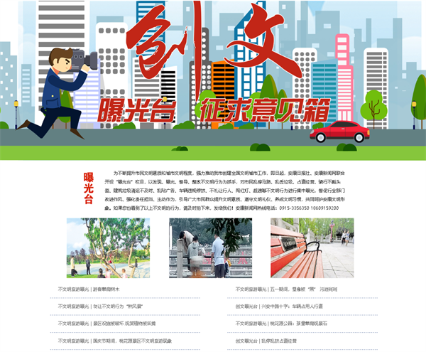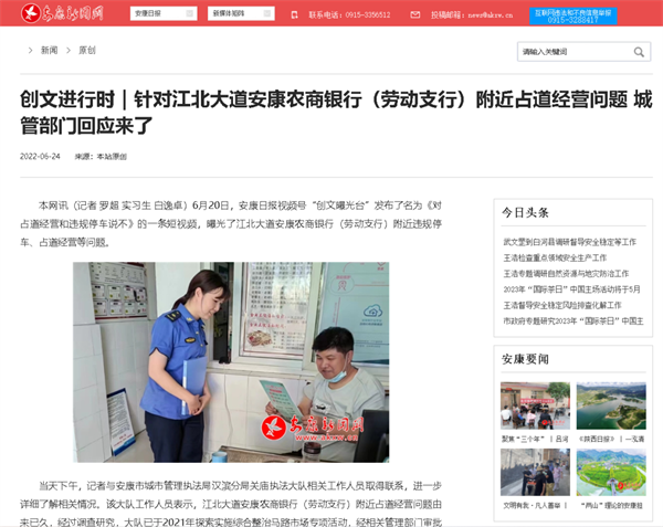 安康新聞網(wǎng)履行媒體輿論監(jiān)督職能,聚焦民生熱點,開辦《創(chuàng)文曝光臺》輿論監(jiān)督專欄,對不文明現(xiàn)象進(jìn)行曝光揭露,發(fā)布批評性報道60余篇,微信視頻號采寫制作曝光類視頻稿件10余件,為提升市民文明素質(zhì)和城市文明程度,貢獻(xiàn)媒體力量。同時積極開展調(diào)查性報道,追蹤事件真相,發(fā)布《創(chuàng)文進(jìn)行時|針對江北大道安康農(nóng)商銀行(勞動支行)附近占道經(jīng)營問題 城管部門回應(yīng)來了》等一批原創(chuàng)新聞,反映群眾呼聲,推進(jìn)問題解決,體現(xiàn)地方黨媒的責(zé)任與擔(dān)當(dāng)。