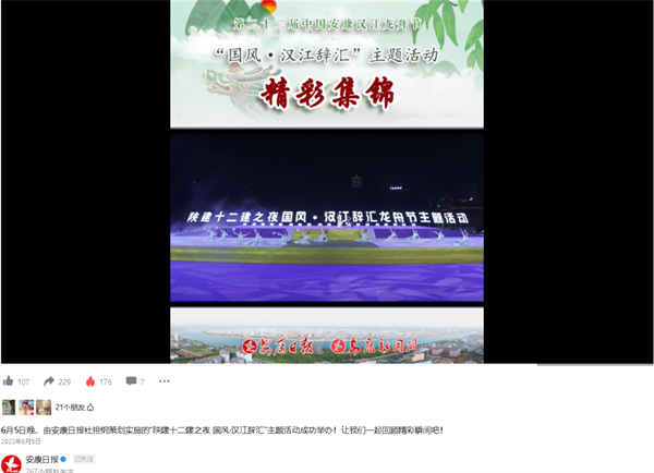 深化融合創(chuàng)新,全力打造高附加值文化創(chuàng)意產(chǎn)品。2022年第二十二屆中國安康漢江龍舟節(jié)期間,由安康日報社統(tǒng)籌承辦“國風(fēng)·漢江辭匯”主題公益演出活動,安康新聞網(wǎng)全力配合,落實晚會執(zhí)行、線上直播、采風(fēng)活動全程宣傳,“國風(fēng)·漢江辭匯”演出全網(wǎng)現(xiàn)場直播,點擊量達(dá)到100W+。活動還引發(fā)全網(wǎng)多家媒體爭相報道。截至目前,包括人民日報、中央廣播電視總臺《藝術(shù)傳承》官網(wǎng)、今日頭條、北京在線、山東熱線等70余家中省市媒體單位陸續(xù)轉(zhuǎn)載報道。