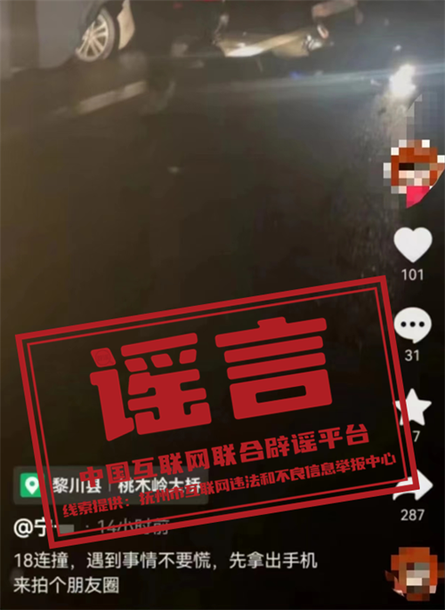 真相:近日,有網(wǎng)民在某網(wǎng)絡(luò)平臺(tái)發(fā)布“江西黎川境內(nèi)福銀高速贛閩交界處發(fā)生一起18車(chē)連撞重大交通事故”的視頻。經(jīng)向?qū)俚馗咚俳痪藢?shí),黎川高速路段并未發(fā)生18車(chē)連撞事故,該視頻信息系謠言。目前,警方已依法對(duì)散布網(wǎng)絡(luò)謠言視頻者予以行政處罰,并責(zé)令其刪除相關(guān)不實(shí)視頻。(來(lái)源:“撫州網(wǎng)警”微信公眾號(hào))