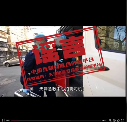 真相:近期,有網(wǎng)民在某短視頻平臺發(fā)布天津市急救中心救護(hù)車駕駛員招聘信息。經(jīng)核查,天津市急救中心近期沒有駕駛員招聘計劃,該信息不屬實,系網(wǎng)絡(luò)謠言。且該用戶在中心不知情情況下擅自利用中心員工工作照片進(jìn)行虛假宣傳,造成惡劣影響。(來源:“天津辟謠”微信公眾號)