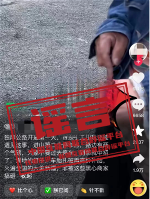 真相:據(jù)新疆文化和旅游廳官方微信公眾號消息,獨庫公路已于6月1日10時正式通車。近日,網(wǎng)傳一則“獨庫公路亂撒釘子,商家補胎賺錢”的視頻內(nèi)容,引發(fā)網(wǎng)民關(guān)注。經(jīng)新疆烏蘇市公安局調(diào)查核實,視頻反映的事發(fā)地處于獨庫公路K599路段,為保障通行安全,公路有關(guān)部門已對該路段進行巖壁防護網(wǎng)加固工作。視頻中現(xiàn)場釘子來源為施工方拆卸固定模具板材時散落的舊釘子,且根據(jù)現(xiàn)場排查,周邊并無汽車輪胎維修點位。視頻發(fā)布者的車胎并未被釘子扎破,亦不存在高額補胎的情況。(來源:“新疆網(wǎng)絡(luò)辟謠”微信公眾號)