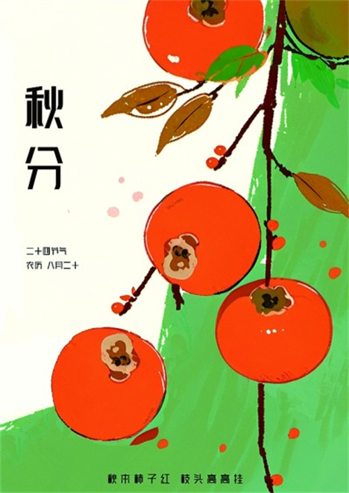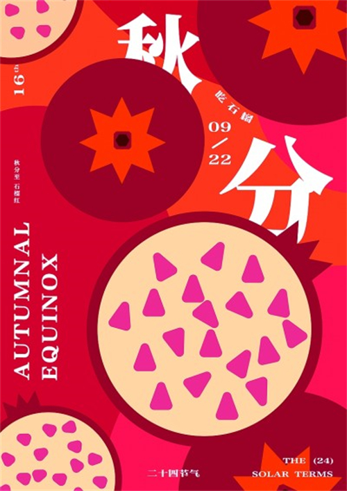 秋分到,柿子紅。柿子又稱“朱果”,立秋之后的柿子更加甜美可口。圖①作品取柿子的吉祥寓意,刻畫了一幅秋柿高掛枝頭的場景,成熟的柿子飽滿而有光澤,看起來非常吸引人。圖②則以“秋分吃石榴”為主題展開創(chuàng)作,將俯視的石榴與切開的石榴圖形化,通過形狀的大小對比以及色塊的明度變化,增加了海報(bào)的視覺層次感和前后縱深感,使單一元素變得豐富;在色彩選擇上,通過暗紅色與淡黃色的對比,帶來了比較跳躍的視覺體驗(yàn)。