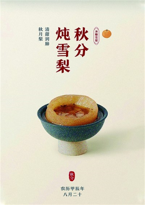 秋風(fēng)漸起,寒涼氣息加重。秋分時(shí)節(jié)在飲食調(diào)養(yǎng)方面,應(yīng)多喝水,吃清潤的食物。圖⑦設(shè)計(jì)的中心元素是冰糖燉雪梨,象征秋季的清潤與養(yǎng)生,也暗示了秋分時(shí)節(jié)陰陽調(diào)和、天地平衡的自然哲理。
