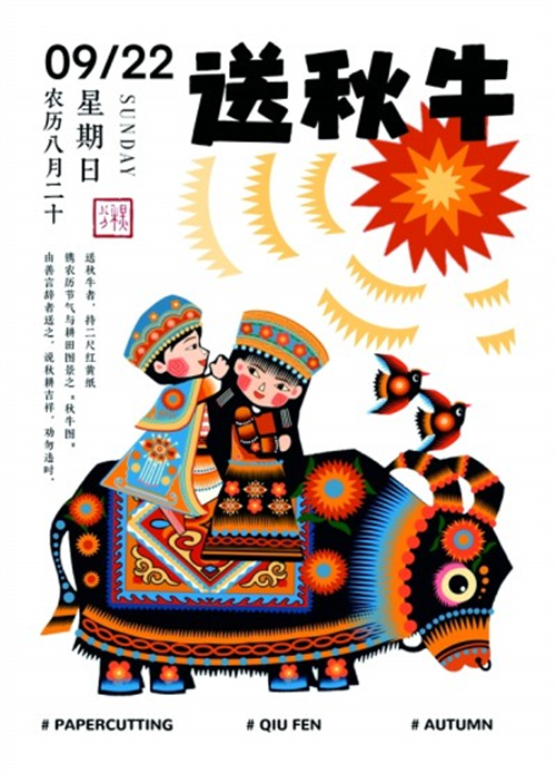 秋分是一個(gè)重要的農(nóng)業(yè)節(jié)氣,也是中國傳統(tǒng)文化中的重要時(shí)刻,民間很重視秋分節(jié)氣,有著各種秋分習(xí)俗。例如“送秋牛”,一般在紅紙或黃紙上畫農(nóng)夫耕田圖樣,再印上全年農(nóng)歷節(jié)氣情況,送圖者都是些民間善言唱者,主要說些秋耕吉祥、不違農(nóng)時(shí)的話。圖③借用工藝美術(shù)家?guī)焓缣m的剪紙作品形式,將其基本圖形進(jìn)行組合再創(chuàng)作,配色選用橙黃為主、藍(lán)色為輔,顯得既貼近傳統(tǒng),又生動有趣。