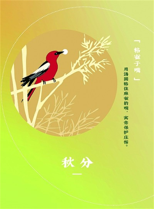 秋分的另一個(gè)有趣習(xí)俗是“粘雀子嘴”,即用一些沒有餡兒的糯米團(tuán)子,以竹簽串好插在田間地頭,喂食給鳥雀,寓意“粘住麻雀的嘴”,以保護(hù)莊稼、確保糧食收成。圖⑤作品采用橙黃和黃綠色調(diào),營造出秋日的溫暖氛圍;海報(bào)中央的圓形圖案框是湯圓的抽象再現(xiàn),圓框內(nèi)麻雀站在枝頭,嘴中叼著軟糯的湯圓,形象地展現(xiàn)了“粘雀子嘴”的習(xí)俗。